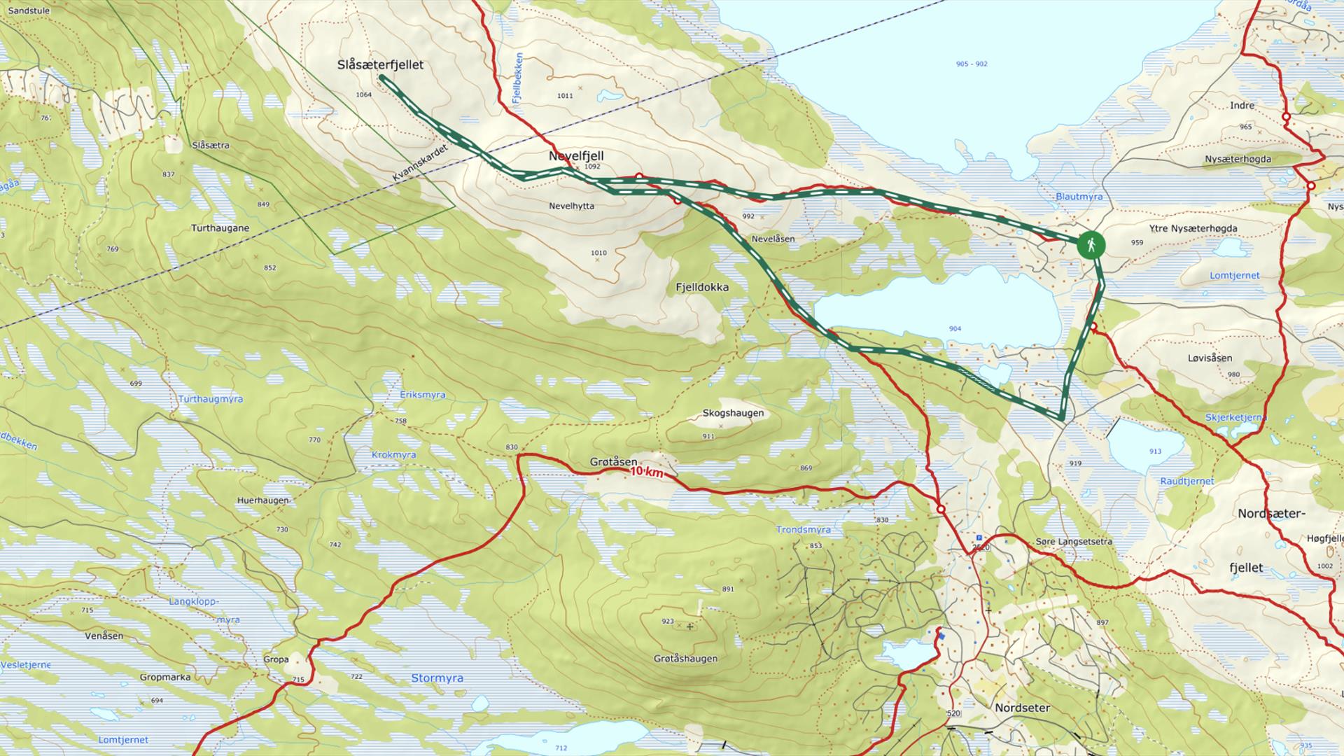 From Slåseterfjellet mountain, return to Nevelfjell and follow the trail down to Fjelldokka and further on to the outlet of lake Nevelvann. Follow the road along the lake with its numerous beautiful cabins. From the main road, return to Nevelåsen and your starting point.